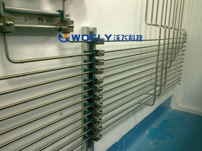 8.氣瓶間內(nèi)的氣體鋼瓶與減壓器器之間采用SS316L高壓金屬軟管或不銹鋼盤管連接無滲透。高壓軟管為柔性軟管,以保證連接的方便性。并自導(dǎo)防護鋼纜,預(yù)防極端情況下,鋼瓶閥損壞等現(xiàn)象帶來的高壓“抽鞭”事故。減壓器與管道的連接方式為雙環(huán)卡套。